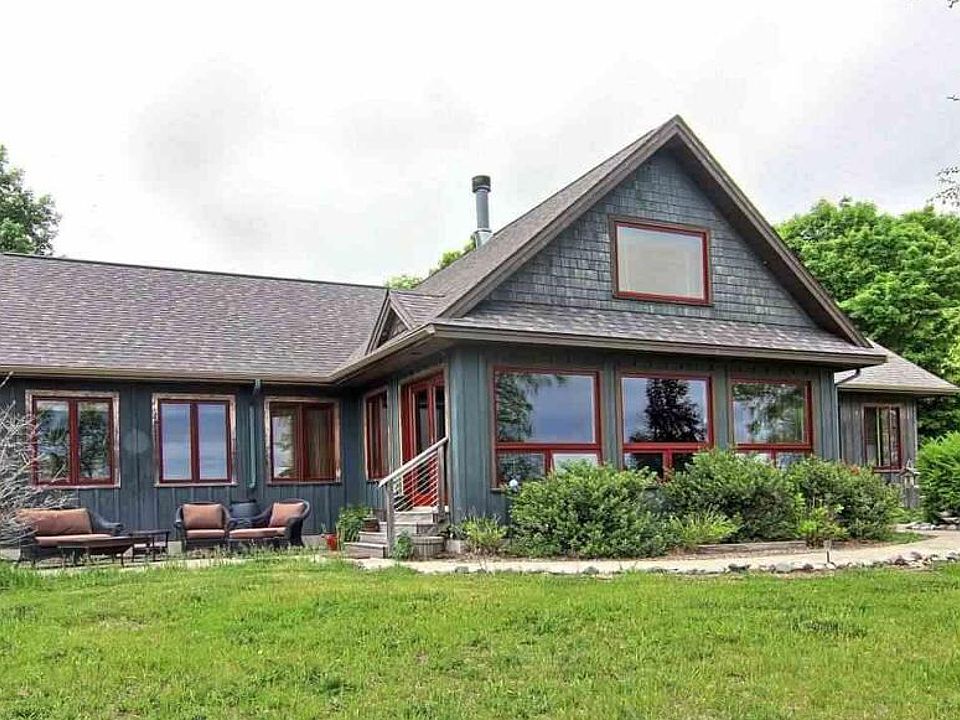- Great open floor plan with year round views of Grand Traverse Bay and winter views all the way to North Manitou when leaves are gone. High ceilings aren't an issue with the radiant flooring. 25 acres of Meadow and Hardwood. - Large Master bed and bath on main floor with walk-in-closet and bath with double vanity, rain shower, and jetted tub. Custom cabinetry in Master bath, Kitchen and downstairs bathroom. - Main floor includes Kitchen, Dining and Great room separated by two-sided fireplace, large, sunny family room, master bedroom, office/bedroom, and additional full bath. - Downstairs you'll walk through the large "Play room" to the hall, with two bedrooms on the left, laundry and full bathroom on the right. The end of the hallway leads you into the final bedroom and another doorway leads to storage/utilities. - All bedrooms have French Doors leading out to Patio, Master leads to deck.