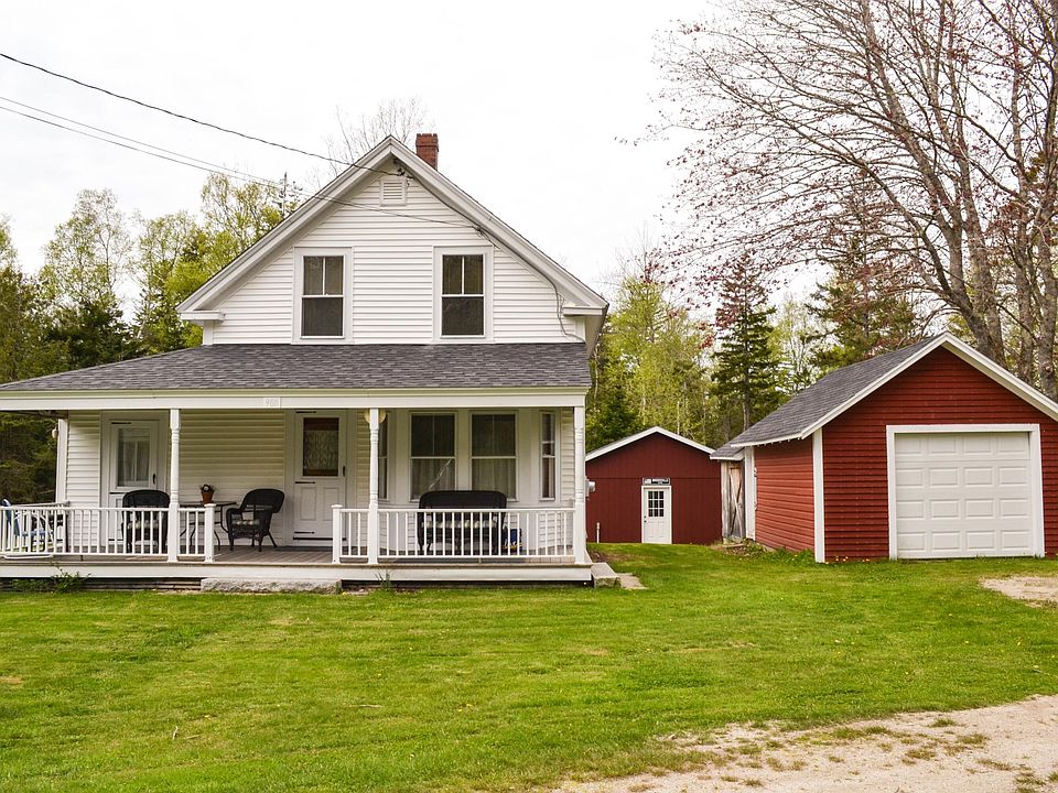 Relax and unwind on the inviting front porch of this charming Cape, nestled in a prime location near Bucks Harbor and Cape Rosier. It showcases 3 bedrooms, 2 bathrooms, a formal dining room, and a living room, along with a first-floor primary suite as well as laundry in the entry. The home's original charm is evident in its wood floors, wainscotting, and period trim. Explore the best of Maine just a short drive away. Additionally, the property boasts both a detached 1 car garage and a separate spacious workshop with abundant storage. Schedule your viewing today!