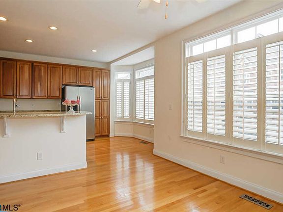 Former model home! Upscale, bright, and airy, 3 bedroom town home within walking distance to shopping and restaurants. Eat-in kitchen has bay window, top quality stainless steel Bosch appliances, granite counter tops, cherry cabinets, and hardwood floors. Formal dining room with Jeffersonian columns. Living room with gas fireplace, double opening french doors leading to back deck, and transom windows. 2 huge master suites on 3rd floor. Both baths have jetted tubs, ceramic tiles, glass door showers with Kohler fixtures, double vanities. Both suites have large walk-in closets with shelving and carpet. Third bedroom has separate entrance on main bottom level in rear. 2 car garage with workbench and storage. Custom plantation shutters.