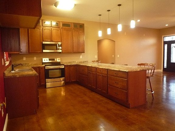 Beautiful lake view from this 5 bedroom, 3 bath home. The home features a split floor plan with 4 bedrooms (each with a large closet) and 2 baths on one end. A large master bedroom with walk in closet and bath as well as an office with a separate outside entrance on the other end. The living room and kitchen are large and open with high ceilings and great for entertaining. The living area is wired for surround sound. Scored and stained concrete floorsthroughout. Clean and easy to maintain. There are 2 RV hook up connections.