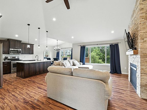 Step inside to soaring vaulted ceilings, a cozy fireplace, and a bright, open living space. The kitchen is designed to impress with stainless steel appliances, a sought-after gas stove, soft-close cabinetry, and plenty of room for gathering. A built-in desk area, welcoming foyer with storage, and a spacious mud/laundry room off the 3-stall garage keep everyday life organized. The garage itself is a rare find—fully finished with heat/AC and a bonus rec area.