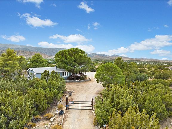 Welcome to this beautifully secluded home and property located in highly desired South Pinon Hills sitting at the base of the San Gabriel Mountains. This 1,772 +/- square foot home sits on over 2.2 acres of manicured land with stunning views of the surrounding valley. The first thing you will notice is that everything has been pristinely taken care and improved upon by the owners over the years. This manufactured home is a triple wide and offers a beautiful custom deck that wraps around the home. Labeled as 2 bedrooms there is a third room with closet that could very easily be converted to a conventional bedroom. The massive detached frame built garage offers 1,872 square feet offers space for all your vehicles and toys. The roll up doors are 10 feet tall and the entire garage space is finished with drywall and offers open, tall ceilings. Included in this space is an attached bonus room that is 26.5 X 12 and makes a great space for guests or recreation. Additionally there is a full size bathroom that connects to both this bonus room as well as the garage. Along side the garage is the oversized RV carport. This property offers fully paid off solar as well with a total of 28 solar panels located on the roof of the garage. You enter the home into a spacious living room with tall windows and a wood burning fireplace. You can wrap around to the opening dining room and kitchen space which offers plenty of cabinets and counter space for storage. The laundry room is also spacious and offers additional storage. This also leads out to the back with a premium attached carport to park right along the back of the home. The other side of the home offers to office / 3rd bedroom, as well as the hall bath, and 2 other bedrooms including the primary and its renovated and updated primary bathroom with 2 separate vanities and walk in shower. The primary bedroom also has a customized closet offering plenty of additional storage. There is also a slider off the primary bedroom that leads you to the spacious side deck area with a built in spa. The property offers a private driveway with an automatic solar gate. The property has been thoughtfully laid out with retaining block surrounding the home, gravel driveway and a ton of mature pine trees surrounding the home. The property is perfect for those with equestrian needs as it offers 3 horse stalls, a corral, wash station, as well as 2 sheds and additional covered storage for hay.
