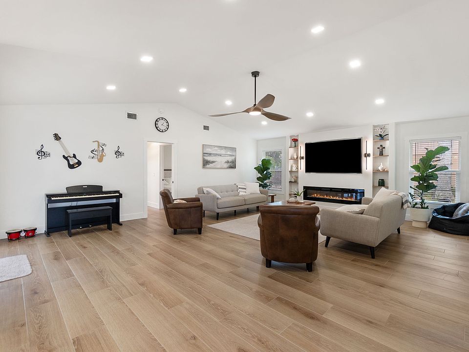 Linear fireplaceContemporary backsplashLarge poolHigh end designer finishesHuge eat-in quartz islandEnsuite bathScreen enclosure