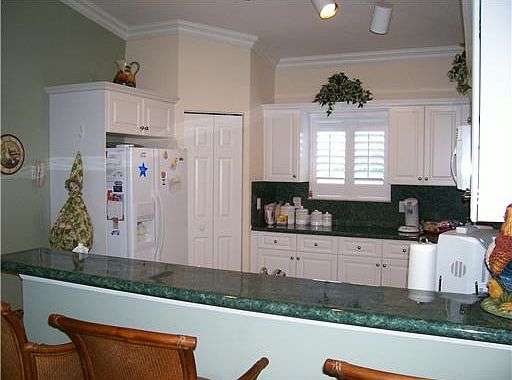 Stunning corner Villa, 1-car garage on the Lake, extended scrnd Patio, crown molding, upgraded Kitchen cabinets, all tile fls, designer ceiling fans & fixtures, Plantantion Shutters on windows, accordion hurricane shutters, custom built-ins in Den/BR