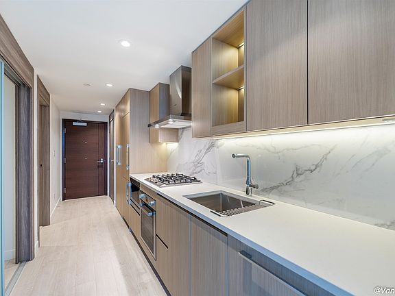 Welcome to Park Boulevard by Concord Pacific - this impeccably luxury built 1-bed and den high rise condo on the 14th floor features breathtaking valley and mountain views from your private 185 SQFT patio. This efficiently 547 SQFT laid out floor plan features: Air Conditioning, European-Blomberg appliances, soft close cabinets, quartz counter tops, gas stove, built-in microwave, built-in lighting in bathroom mirror, washer & dryer. Unparalleled amenities include free access to business & fitness centers, swimming pool, tepidarium, sauna, indoor badminton, gym, sports lounge, outdoor patio & garden lounge. Featuring 24 hours concierge with security cameras in underground parking. 1 Parking included.