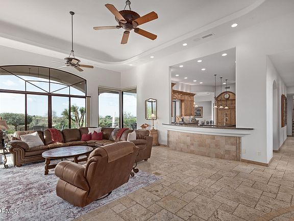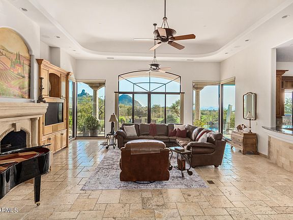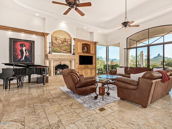 Arizona living at its best in this 5,391 sq ft custom home within Talus, a gated golf community in Troon North. Set on 1.092 acres, revel in unmatched panoramic mountain, golf course, and city light views—NO obstructions, just breathtaking scenery. Enjoy stunning sunsets over the 3rd fairway of the renowned Monument Course. Inside, meticulous craftsmanship and attention to detail shine. The chef's dream kitchen boasts Sub-Zero & Wolf appliances, a walk-in pantry, and a pass-through window to the outdoor BBQ kitchen. The great room features a gas Cantera fireplace and floor-to-ceiling glass framing Pinnacle Peak & Thompson Range. The primary retreat offers a private patio, spa-like bathroom, and a flex room/gym. Main-level highlights include a private office, dining room, ensuite bedroom w/ separate entrance, and a laundry room.