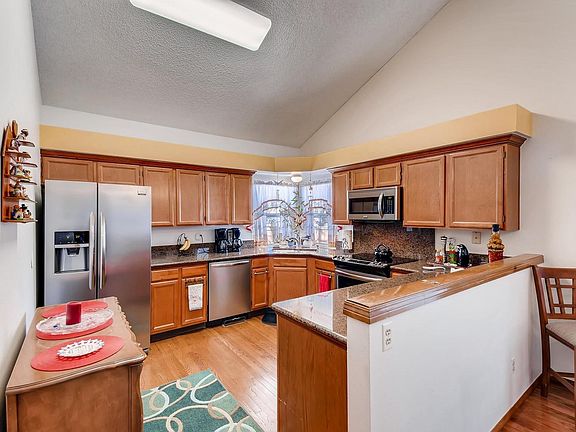 Rarely available Ranch style end unit featuring beautiful wood floors flowing throughout the entry, Living room, Dining room, Kitchen & Master Bedroom. The updated Kitchen boasts Stainless appliances & slab granite counters, plus the Living room has a wonderful bay window & gas fireplace. Enjoy the open feeling with the vaulted ceilings through all rooms, excluding the baths, and skylight. The Master Bedrooms is spacious and includes dual closets plus private bath with tile counter & oversized soaking tub with support bars. The Guest Bedroom easily functions as a Den with it's French doors & private access to guest bath with new tile flooring & tile counter. There's storage & Laundry in the basement, as well as the 2 car Garage & crawl space for additional storage. Don't miss the private deck off of the Dining room, or all of the beautiful common grounds, pools & facilities throughout the community. Easy access to shopping, bus, & Highway 36 or I-25 for additional support services