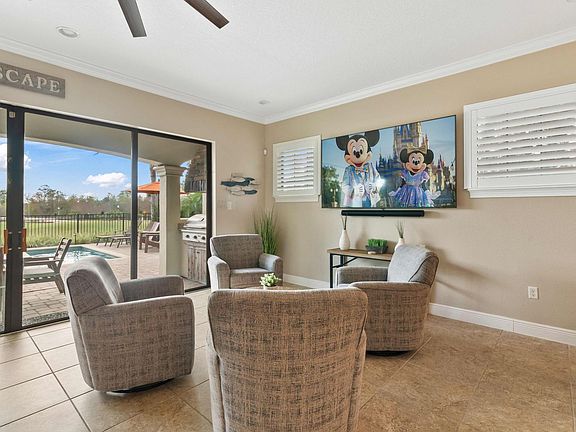 Welcome to Fairway Haven, a charming 5-bedroom, 5-bathroom retreat nestled in the prestigious Reunion Resort. Spanning 3,403 square feet and designed to accommodate up to 12 guests, this delightful home blends timeless elegance with modern comforts, making it the perfect destination for families or groups seeking a relaxing and entertaining getaway. With its unique Harry Potter-themed movie game room, serene outdoor space, and inviting traditional decor, Fairway Haven promises a memorable stay. Step inside and discover the warmth of this beautifully designed home. The traditional furniture and tasteful decor create a cozy and welcoming ambiance, perfect for relaxing after a day of adventures. The fully equipped kitchen is a highlight, featuring modern appliances, ample counter space, and everything you need to prepare delicious meals. Adjacent to the kitchen, the dining area provides a lovely setting for family dinners, while the living area offers plush seating and a flat-screen TV for unwinding with loved ones. Each of the five bedrooms is thoughtfully designed to provide comfort and tranquility. With luxurious bedding, spacious layouts, and en-suite bathrooms, these rooms offer a restful retreat for every guest. Whether traveling with family or friends, Fairway Haven ensures that everyone has their own private sanctuary. The outdoor area of Fairway Haven is equally impressive, offering a private oasis for relaxation and connection. The pool and patio overlook the lush greens of the golf course, providing a serene backdrop for your stay. The summer kitchen makes al fresco dining a breeze, while comfortable seating invites you to soak up the Florida sunshine or enjoy a quiet evening under the stars. The tranquil setting and luxurious amenities make the outdoor space a favorite among guests. Located in Reunion Resort, Fairway Haven provides access to world-class amenities, including championship golf courses, resort pools, and a variety of dining options. Whether exploring nearby attractions, indulging in resort activities, or simply enjoying the comfort of this beautiful home, every moment at Fairway Haven is designed to delight.