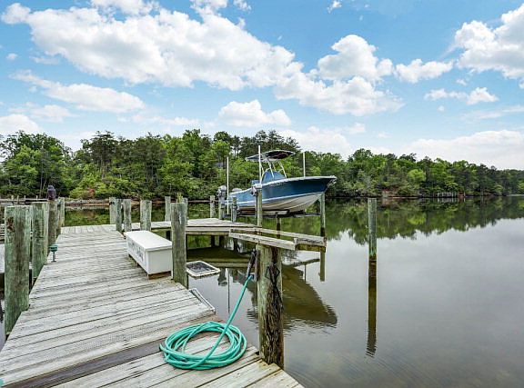 Charming three bedroom two bath home with guest apartment over detached garage and storage shed on Lowery Creek. Lovely waterside deck for dining and entertaining. Nice elevation outside of the flood zone and pretty creek views of protected Lowery Creek. The 2.26 acre lot is partially wooded offering privacy and plenty of elbow room. The garage is heated and cooled. Guest apartment over garage features a bedroom, full bath, living room, dining area, waterside deck and kitchen with range, sink, & refrigerator, Guest apartment has a dedicated heat pump, washer and dryer, hot water heater and septic system. Pier features a T head and 8,000# boat lift, swim ladder, and adirondack chairs. DEEP WATER 6 FEET MLW with heavy duty outboard pilings for large vessels. Quick access right out to the Corrotoman River and beyond. Make sure you watch the video to get an aerial perspective of the waterways.