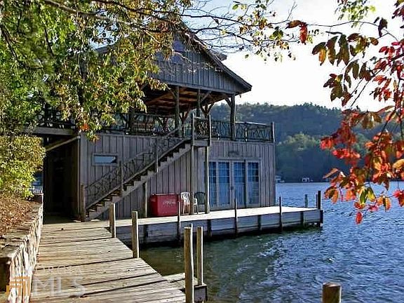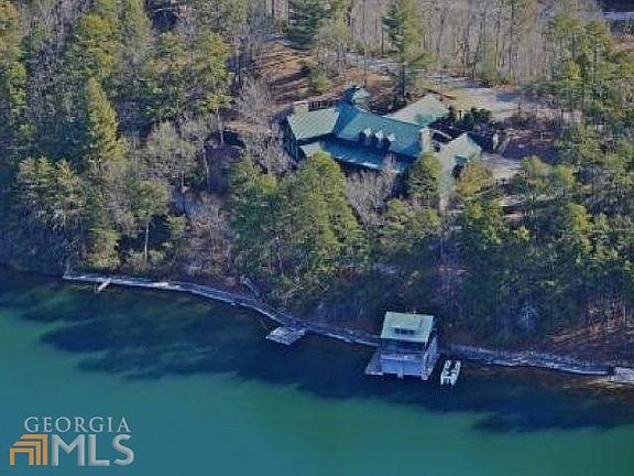 NEW PRICE. Spectacular Bear Lodge on Lake Rabun. With almost a six acre lot and 450' of shoreline, this home has privacy, seclusion, and accessibility to Atlanta and Clayton. Massive windows in the great room showcase the brilliant lake and mountain views. Chef's kitchen with all the high end appliances provides a pivotal place for entertaining . Stone stacked fireplaces are located in the great room and screen porches. Master suite is on the main level. Terrace level has second living area, game/billard room, bunk room, and plenty of storage areas. Two stall covered boathouse is a few steps away. The highest quality building materials and handicraft is evident throughout. This is a must see! Owner will consider financing to qualified Buyers.
