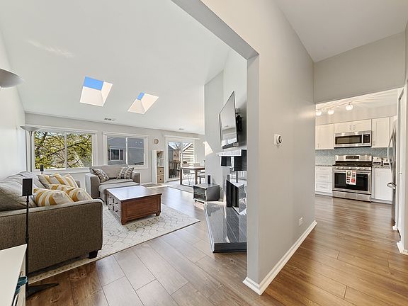 Completely rehabbed 2bed/2bath in sought after Stevenson High School district. Second floor unit flooded with natural light. Vaulted ceilings, skylights, newer lighting and custom window treatments throughout. Gorgeous gas fireplace and Nest thermostat. New floors and open floor plan with sizable balcony off the dining room. White kitchen with granite countertops, custom backsplash and stainless steel appliances. Master bedroom has walk-in closet and en suite bathroom. Newer furnace, AC, water heater and appliances. Private garage parking and additional exterior parking space. Short walk to the pool, tennis courts and playground.