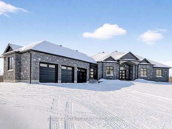 Welcome to this exceptional 2025-built modern bungalow offering 2,596 sq. ft. of refined living space on just under 2 acres, where modern luxury meets peaceful country living, just minutes from city conveniences. Ideally located near the Canadian Tire Centre, Kanata's top restaurants, shopping, and amenities, this sought-after neighbourhood is known for its upscale homes, space, and strong sense of community, next to West Lake Estates. The curb appeal impresses with a beautiful brick front, rear siding, a three-car garage with a heat pump, and an expansive driveway. Step into the welcoming foyer, where warmth and comfort immediately set the tone. The main level is filled with abundant natural light and features a versatile den-ideal for a home office, playroom, or additional storage. The living room is both elegant and inviting, creating a seamless flow into the bright, modern kitchen, complete with a large island, spacious pantry, refrigerator, gas stovetop, wall-mounted oven, hood fan, dishwasher, microwave, and wine fridge-perfect for both everyday living and entertaining. A dining area sits perfectly between the kitchen and living room, complemented by a formal dining room for hosting memorable gatherings. The laundry and mudroom combination offers exceptional convenience and storage, with a powder room located just across the hall. The primary suite is a true retreat, featuring a generous walk-in closet and a luxurious five-piece ensuite. Two additional well-sized bedrooms and a four-piece bathroom complete the main floor. Downstairs, the fully finished lower level offers endless potential to customize the space to your needs, already including a four-piece bathroom-ideal for future living space, recreation, or guest accommodations. A rare opportunity to enjoy modern design, a premium custom-built home, and generous land in one of Carp's most desirable locations.