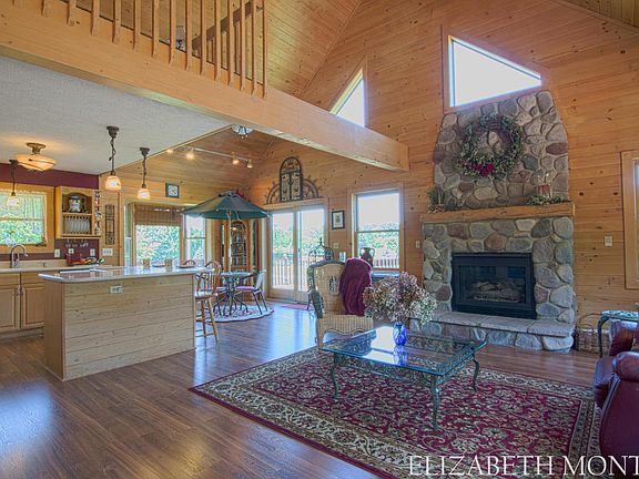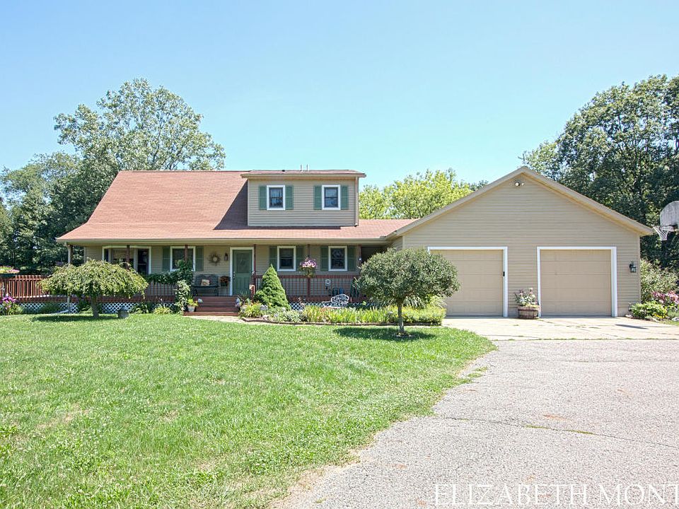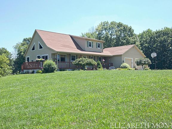 Unique 1 1/2 story cape cod sits on 2.7 peaceful acres on a private drive with only 5 other homes. The wrap around porch, landscaping, & gardens are just incredible! The pond & woods behind this home attract much wildlife, such as song birds, ducks, turkeys, deer and blue heron! This lovely home has soaring ceilings planked with gorgeous light knotty pine wood, an open floor plan w/ high end laminate floors, kitchen with corian counters, island with snack bar and all appliances! Each level has a bedroom & full bath, plus the laundry is on the main floor! Upstairs you will find a loft area and the master suite with a HUGE walk-in closet, plus a jetted tub in the master bath. In the walk-out basement, there is an enormous rec room with newer carpet, the 3rd large bedroom and 3rd full bath! In 2014,the exterior was freshly painted,decks all stained, & a new water softener system was installed. There is also a newer furnace, AC, water heater & sump pump! Perfect location, truly a must see