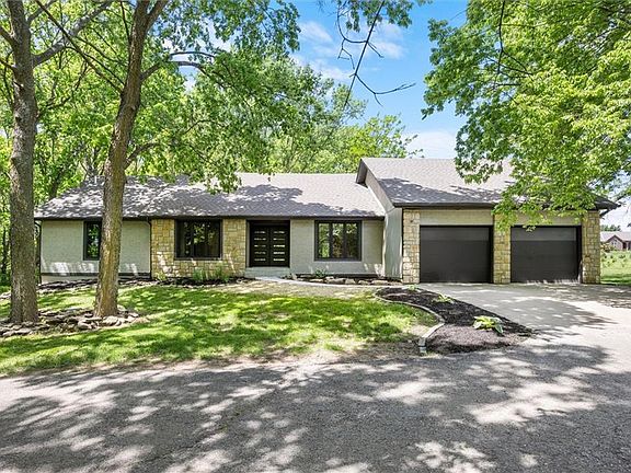 Meticulously renovated modern glam ranch on private, heavily treed 1.76 acres! De Soto schools, Eudora address. So much new including casement windows, kitchen, bathrooms, flooring, int/ext paint, lighting, hardware, garage doors, ext doors, deck, sidewalk, etc. Open concept floor plan with vaulted wood ceilings and natural stone fireplace in the great room. Kitchen boasts all new cabinets, stainless Kitchenaid appliances including gas range, quartz counters, glass backsplash & ample pantry space. Flexible floor plan with bonus room that can function as formal dining or office space. Luxury primary suite features a double vanity, freestanding tub, dual head shower & massive walk-in closet. Enclosed sun room with vaulted ceiling and HVAC. Large glass windows and doors span the rear of the home displaying gorgeous wooded views, allowing you to feel one with nature and offering mutliple access points to the deck for indoor/outdoor living. The back yard features a beatiful sunken natural stone firepit. Conveniently located mud room and half bath off garage. The finished basement nearly doubles the sq ft of the home and is an entertainers paradise with 2 sprawling rec space areas, full bathroom and separate room with walk-in closet that can function as a non-conforming 4th bedroom, home gym, office, etc. Front circle drive provides plenty of guest parking. Includes two parcels of land providing opportunities to sell one, build another home, add a shop, etc. House sits on .85 ac with the adjoining lot to the south being .91 ac. Easy access to K10 allows quick commute to Lawrence or KC, ~4 miles from new Panasonic plant. For sale by Owner/Agent.
