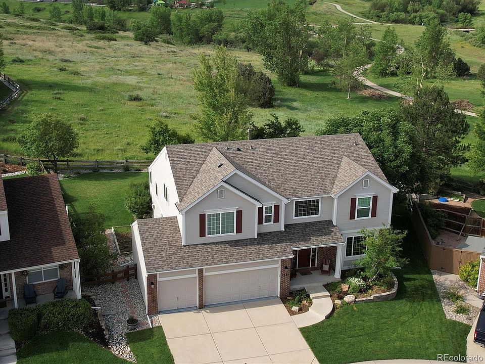 This is it! Outstanding Cul-De-Sac location! Impressive 0.23 acre lot backing to vast Open Space! Highly maintained, move-in ready home in coveted Heather Hill. Livable floor plan features 4 bedrooms upstairs, 3 baths, & partially finished basement. NEW: roof, refinished hardwoods, rod iron railings, light fixtures. Newer windows, HVAC. Freshly updated kitchen boasts gorgeous quartz counters & subway tile backsplash, stainless steel appliances (including dual ovens & cooktop), island, pantry & breakfast nook. Opens to spacious family room with soaring vaulted ceilings, fireplace & built-in cabinets/shelving. Notice the ultra-convenient, reconfigured custom layout with the garage entry moved to the sizeable mud room! Features built-in wall storage/bench unit. This room also offers office space with built-in desk/cabinets & updated powder room! Formal living & dining rooms complete the main level. Outside find the ultra-private, park-like yard with open space views, many trees, & covered patio with fan & speakers. Head to the Primary Suite, which boasts mountain views, vaulted ceiling with fan & large walk-in closet. Beautifully appointed (brand new remodel!) 5-pc Primary bath has quartz counter, frameless shower & free-standing tub. 3 more beds up share updated 4-pc hall bath. Convenient upper laundry with W/D, shelves & folding counter. More living space in the partially finished basement that has a wide-open recreation room to meet many needs. Crawl space & tons of storage/closets throughout. Oversized, finished 3-car garage has new floor coating, workbench & cabinets. Just steps to the trailhead leading to the dog park, community garden & Dad Clark Park along with miles of walking/biking trails. Walk to top-rated Heritage Elem & Valor HS, feeds to Mountain Vista HS! Low HOA gets 4 rec centers, pools, tennis, fitness. Near Town Center, Central Park, shopping & dining. Easy to C470, LightRail. Includes 14-mo Buyer’s Warranty. Too much to list! Must see!