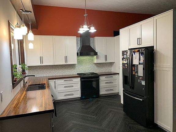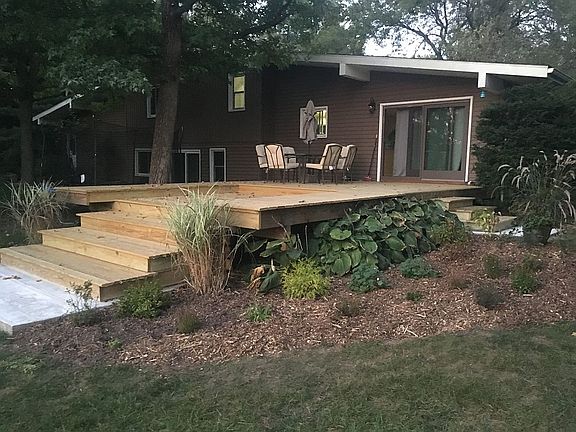 Mid-century split-level home with 4 levels. Upper level has 3 bedrooms, a 3/4 bath with shower off the hall shared by 2 bedrooms and a master bath suite with walk-in shower and soaker tub off the large master BR. Second level is a modified open concept kitchen-DR-LR. The 250sf remodeled front deck leads into the LR-DR, and oversized slider doors off the DR lead out to the remodeled almost 600sf back deck overlooking the large yard, a small creek and 2 neighboring ponds. The kitchen was completely remodeled in early 2020 with black porcelain floors, new casement window and over-the-sink pendant lighting, custom Shaker-style cabinetry, slate appliances and custom walnut butcher block countertops. The LR and DR were also recently updated with hickory hardwood flooring. The third level is a walkout that includes 1 large BR that has been converted into a home gym, a remodeled bath with tiled walk-in shower, a modern laundry room and large family room. The family room was remodeled in 2021 and includes recessed lighting, stacked fieldstone veneer wood-burning fireplace with a an antique barn beam mantel, antique barn wood wainscoting and oak hardwood flooring. A door from the laundry room leads to a small patio and a door from the family room opens into the large 2-car garage. Garage was fitted with a new 18ft overhead door displaying retro-style stacked windows that match the character of the home. The bottom level is the basement that includes a large 300sf finished room that could be used as an office, game room or home gym. Two smaller rooms offer mechanical access to the 50 gallon natural gas water heater and (new in 2019) Peerless water softener. The detached 40x60 pole barn has a finished concrete floor, locking back and side entrance doors and large 12ft high barn-style doors to allow entry of an RV or boat. Includes a separate service panel, high-end overhead fluorescent lights, receptacles for 110 and 220, and dedicated workbenches at each end. The work areas include a 3 inch-thick wood counter designed for automotive/mechanical work and the other designed for woodworking and/or painting enthusiasts.