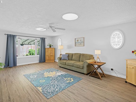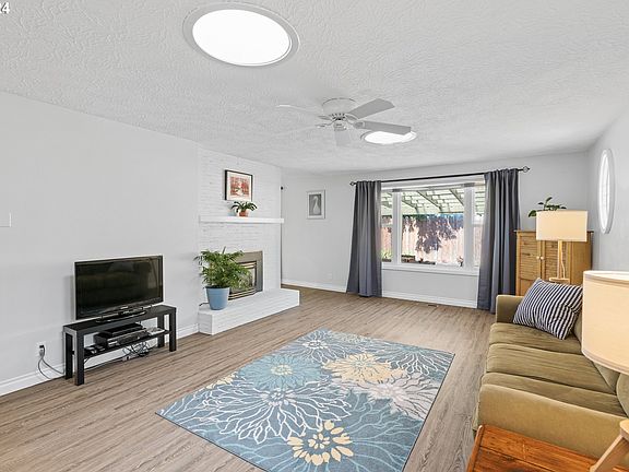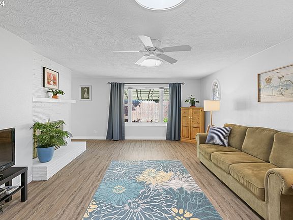 Impeccable Ranch Retreat: Modern Comfort, Serene Yard, Prime Location! This immaculate 3-bed, 2-bath ranch offers the perfect blend of comfort, style, and convenience. Step inside to discover updated, engineered wood floors leading you through an inviting layout. The heart of the home boasts a renovated kitchen featuring sleek quartz countertops, ample cabinet space, a built-in desk area, and an eat bar - ideal for culinary enthusiasts and hosting guests alike. Bathed in natural light, the home exudes a bright and cheery ambiance, creating a welcoming atmosphere throughout. Enjoy year-round comfort with central air conditioning, and cozy up on chilly evenings by the fireplace, adding warmth and charm to your living space. Retreat to the spacious primary ensuite with double closets and luxurious tile floors, offering a serene escape at the end of the day. Entertain or relax outdoors on the expansive covered patio, overlooking the beautifully landscaped yard adorned with raised garden beds and a convenient garden shed - perfect for green thumbs and outdoor enthusiasts. The large driveway and RV parking provide ample space for vehicles and recreational toys. Nestled within the Lewelling neighborhood, this home provides convenient access to schools, parks, shopping centers, restaurants, and entertainment options, ensuring a lifestyle of comfort and convenience. Don't miss out on the opportunity to make this gem yours! [Home Energy Score = 5. HES Report at https://rpt.greenbuildingregistry.com/hes/OR10227444]