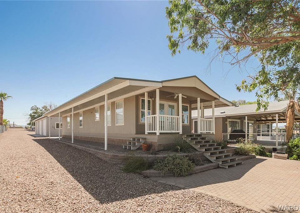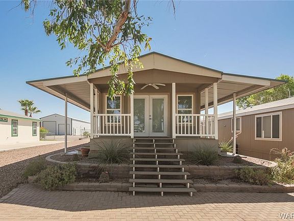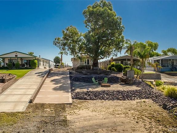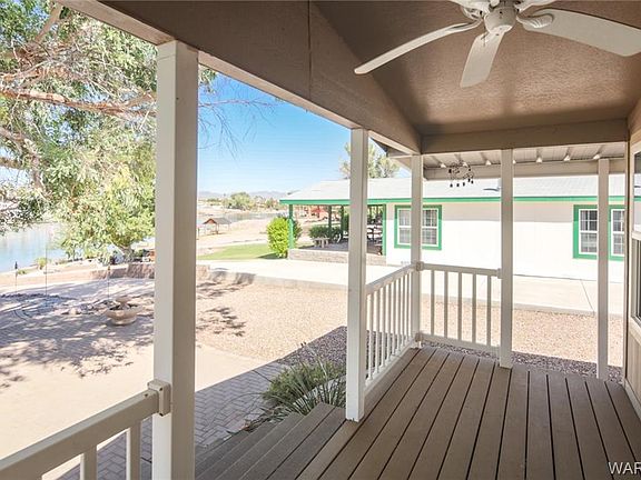 Your very own piece of paradise on the Colorado River!! There is something for everyone on this gated half acre lot. 6 car garage with 4 bay doors. Enough room to park your boats, cars, side by sides or whatever toys you have & covered RV/Trailer parking. Launch your boat from your private ramp or just sit on the covered front porch & watch one of our beautiful Arizona sunsets. Inside has been update with a modern paint scheme, Corain counters, Vinyl plank flooring, Open living area, Tiled back splash & stainless appliances. Buyer to verify Utilities, Sq. Ft. & Flood Plain