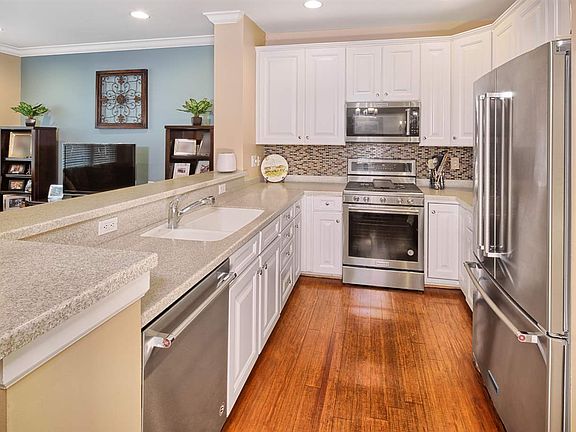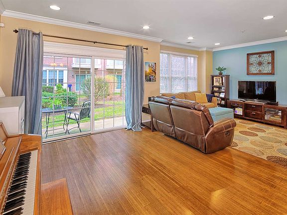 Stylish Bergen style home loaded with upgrades!! Perfect location on a quiet cul-de-sac. Amazing bamboo hardwood floors. Custom back splash and newer stainless steel appliances in kitchen. Custom built-ins: floor-to-ceiling bookshelf around master bedroom slider. Private patio; perfect for entertaining. Renovated master bathroom. Balcony off of master bedroom. Custom closet system in walk-in closet. Newer washer dryer and water heater, Parking for two cars. Attached garage-one car in and one car in driveway. Community features two pools with jacuzzis, tot lot, waterfront promenade and free shuttle to NY Waterways ferry. Steps to 158 bus to NYC. Close to restaurants, transportation and shopping. Must see!!