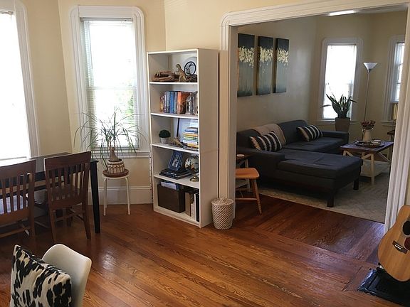 Dog friendly apartment. Available Now. Lovely, and bright, two bedroom apartment plus an office on the second floor which allows your furry companion. Large eat-in kitchen with plenty of room and gas cooking. Both bedrooms are a good size with one of them having a huge closet. Living room/dining room combination is flooded with light. There is a covered front deck and a three season back porch. There is a shared backyard and parking for two cars off-street. 73 bus stop is only one block away and the Wavelery commuter rail is less than 7 minutes away. Walkthrough video available, just ask.
