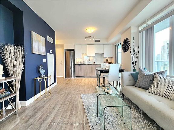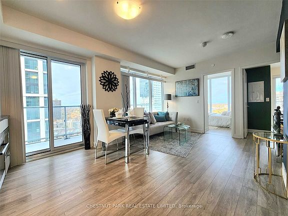 Bright and spacious corner unit on the 25th floor featuring 2 bedrooms and 2 bathrooms across approximately 660 sq. ft. of functional living space. Open-concept layout with abundant natural light and two private balconies. Includes one parking space and one locker for added convenience. Enjoy over 18,000 sq. ft. of interior amenities and more than 10,000 sq. ft. of outdoor amenities, including an outdoor swimming pool, oversized fitness centre, steam sauna, basketball court, BBQ area, amphitheatre, media room, party room with chef's kitchen, and more. Ideal for those seeking modern urban living in a well-managed building.