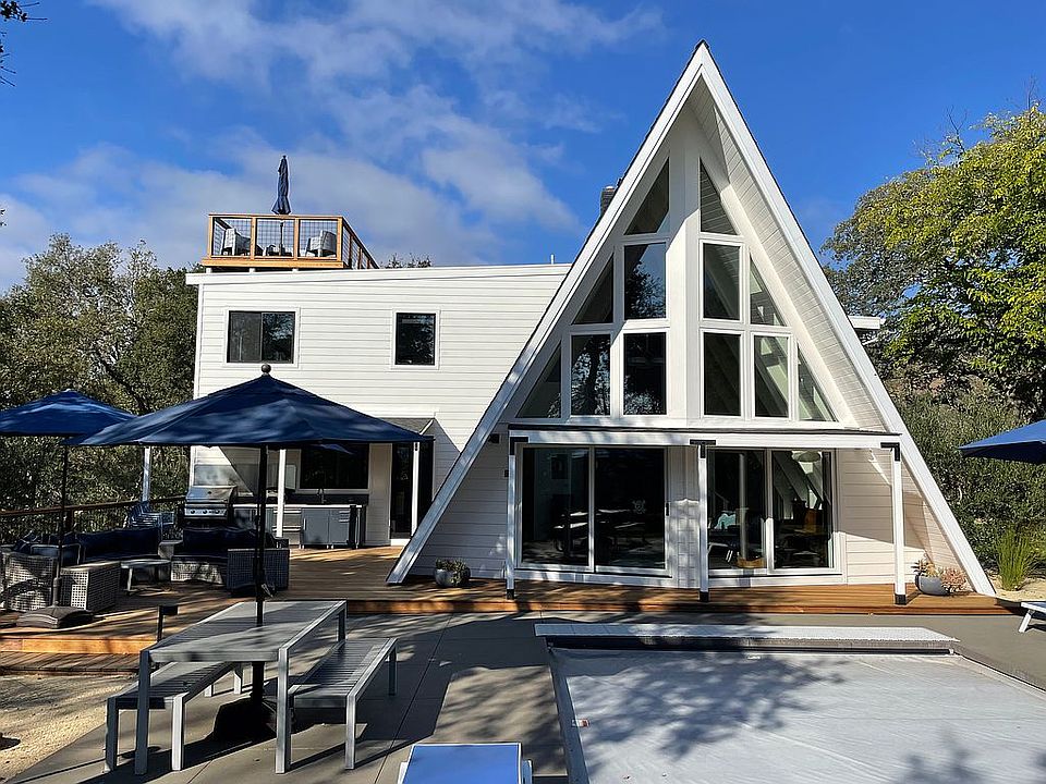 Beautiful 1 acre corner lot filled with oak trees. Significant renovation in 2011 and major addition in 2021. Stunning A-frame with vaulted ceiling, large fireplace and upper master bedroom that overlooks the home and grounds. New addition includes large chef's kitchen and upstairs studio space that serves as second office or fourth bedroom. Heated in-ground modern pool and patio, all new decks in 2022 including amazing roof deck with spiral staircase. Even a finished basement with additional 400 square feet of dry storage. Grounds are fully landscaped and fenced with 2 automated gates. A charming separate cottage studio has central air/heat, full kitchen in 2022, and a private deck, which is fully permitted and licensed for rental. Located in Sonoma in Valley of the Moon on a quiet country road right in the middle of wine country, four miles north of Sonoma Square, and minutes from top Glen Ellen and Kenwood wineries and restaurants.