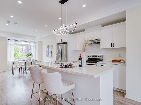 Step into this stunning, contemporary 3-storey townhome that blends style, comfort, and functionality. Featuring 3+1 spacious bedrooms and 3 bathrooms, this bright, open-concept home offers soaring 9-ft smooth ceilings, sun-filled windows, and sleek laminate flooring throughout. Enjoy updated pot lights and elegant chandeliers that add warmth and modern flair. The stylish kitchen with a center island is perfect for family meals or entertaining. Two beautiful balconies provide ideal spots for morning coffee or evening relaxation. The versatile ground floor can serve as a 4th bedroom or home office. Direct garage access and located in a top-rated school district. POTL fee: $161.96/month. This home offers unbeatable convenience - steps to parks, schools, shops, transit, and minutes to major highways and GO Train. This is more than just a home - its a lifestyle!