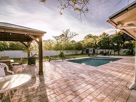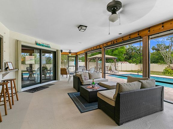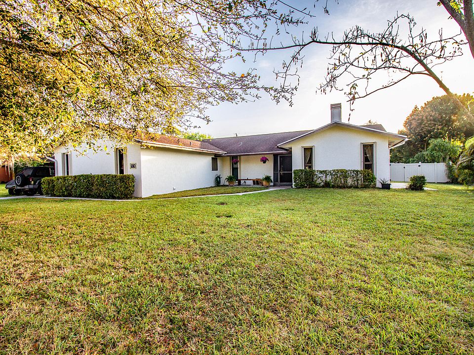 Located in the highly sought-after, Non-HOA community of Florida Gardens, this spacious split floor plan, 3/2 CBS pool home sits on an oversized lot and is ready for family life and entertaining. With almost 3,000 total sq/ft, including an attached garage, you're sure to find a place for everything and everyone. This CBS Florida home is storm ready! Features include hurricane/impact windows (installed NOV. 2021) AND easy-close accordion shutters, underground utilities from pole to home, and generator hookup wired directly into the upgraded breaker box with a 6500 watt generator INCLUDED!North and South sides of property are large enough for a 30+ foot motor home/RV or boat and trailer and have water+electric hook-up. Enter your new Home though the Screened-in Front Porch. The foyer leads you into the Living Room and formal Dining room which spaciously hosts your guest with laminate wood floors, sliding glass doors and a wood-burning fireplace. The home's eat-in kitchen has sliding glass doors, two pantries, breakfast bar, stainless steel appliances and a patio pass through window with views of the pool and backyard. The Family room is conveniently located adjacent to the kitchen and has built-in speakers in the high ceiling for theater or music experience. Down the hall you'll find two bedrooms and a guest bath with full size tub and dual sinks. The main on-suite has a dual sink vanity, walk-in closet, garden view, walk-in shower and a sliding glass door with patio pool access. Lots of closets and closet space, Laundry and utility sink located in garage and large 18" tile throughout most of the home. The private back yard is surround by a PVC fence. The spacious covered patio has two separate doors, ceiling fans, electric, painted concrete floors, bar top connected to kitchen pass through window and plenty of room for lounge seating and a dining table. The deep blue saltwater pool is flanked on both sides with paver decking that creates two separate lanai areas. You and your guests will find distinctive spots to soak in the sun, take a dip or just chill under the pergola. The shallow end of the pool has a sun shelf that easily holds four chairs and has three built-in shade umbrella stands. The deep end has a bench seat that spans the full width of the pool. Some extra features of the home: North and south side of property are large enough for an RV, Motor Home, Jet Skis, Boat and Trailers. North side is a combination of poured concrete and crushed rock and the south side is grass with double-gate access to backyard. The backyard has a new 2 door 15' x 8' free standing shed with concrete paver floor. The patio, family room, and master bedroom have built-in speakers in the ceiling. The family room is also wired with audio wall plugs for external speakers that are included with the home. All three locations can have the same sound being played or each room can be isolated. The audio control and connections are located in the family room. The yard is a canvas for your green thumb. Lots of flowering trees with established fruit trees in the back and a nice shade providing oak in the front. There is a fresh water well ready for your irrigation needs. This almost 3,000 sq/ft home is immaculately maintained, completely move-in ready and priced to sell!