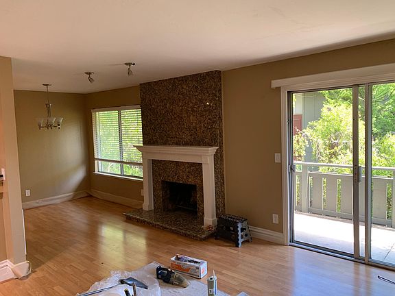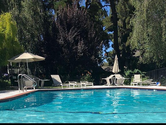 Beautifully remodeled upstairs end unit in the Mountain Brook Condominiums Small private gated complex in which the units cluster around a large garden with birch trees, rolling lawns, waterscape, pool, clubhouse with full kitchen, crackling fireplace, pool table, his and hers baths, and mini gym, that can be reserved for private parties. This unit sits way back from the street and is very peaceful and quiet. You literally can stand on your patio and hear the sounds of nature. Dishwasher, fridge, disposer Sunken living room with beautiful wood-burning fireplace with designer marble hearth Hardwood Floors throughout One small pet is very welcome but cannot exceed 30 lbs due to a very strict homeowner's association rule that restricts pets over 30lbs. Minutes walk from the miles of hiking and biking trails of the Shoreline open space preserve and Google Walk to downtown Mountain View restaurant and entertainment district along Castro St. There is the Mountain View Center for Performing Arts and the many cultural and theatrical events plus wonderful restaurants and bookshops and coffee houses with poetry and open mike nights and music spilling into the street from cafes. This is a real destination walk-around village. Owner pays water and garbage