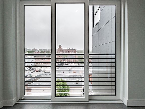 The bedroom offers a peaceful retreat with tall windows that flood the room with natural light. Customized blinds provide privacy when needed, and the hardwood floors add warmth and elegance to the space.