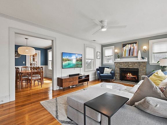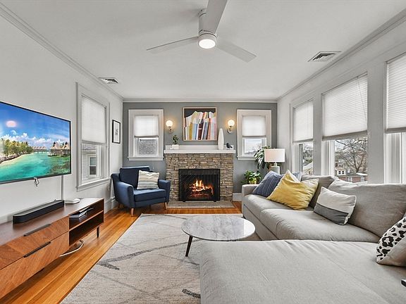 This top-level condo offers the epitome of luxury living. An updated kitchen features stainless steel appliances, granite countertops, and upgraded cabinets. The adjacent dining room boasts a built-in hutch and elegant moldings, providing a refined space for entertaining guests. The living room is both cozy and inviting and features a fireplace and access to a front porch. Hardwood floors throughout the main level add warmth and sophistication to the space. The main level also includes 3 bedrooms and a full bathroom. Upstairs, the primary suite awaits, offering vaulted ceilings, a private balcony, and a luxurious en-suite bathroom. Additionally, the second level offers a versatile bonus room currently utilized as a gym. Additional features include garage parking w/ EV charging, central air and additional storage in the basement. Conveniently located in Watertown near the Belmont/Cambridge line, access to dining and shopping.