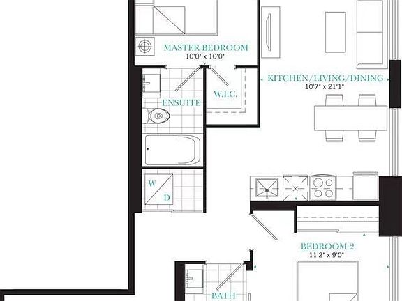 Corner unitFloor-to-ceiling windowsKitchen islandSleek cabinetryStainless steel appliancesOpen-concept layoutSecond bedroom