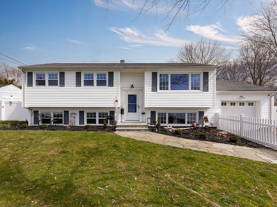 Welcome to your 99 Kenneth Circle! This lovely raised ranch boasts a light-filled open floor plan with a spacious kitchen featuring granite counters, stainless steel appliances, a pantry along with a breakfast bar. The kitchen seamlessly flows into the dining room overlooking the living room, complete with a large picture window that bathes the space in natural light. The main level offers three bedrooms all adorned with beautiful hardwood floor and a full bathroom with a new vanity and tile surround. In the lower level, you'll find a 4th bedroom, a second full bathroom, and a generously sized family room that connects to a large laundry room with plenty of storage, laundry sink and cabinets and access to a one-car garage. Step outside through the dining room's sliding glass doors onto a charming deck, leading down to a patio with a pergola and built-in swings, perfect for enjoying the serene fenced yard that is completely fenced in and backs up to woods Additional features of this home include thermal pane windows, new central air, a new water softener system, a newer septic system, a newer oil tank, new shed with electricity and more. The front yard is fenced with a bluestone porch and walkway, adding to the curb appeal of this beautiful property. Don't miss the opportunity to make this house your forever home Subject to seller finding suitable housing