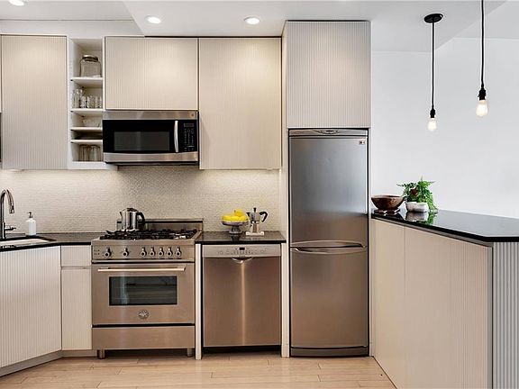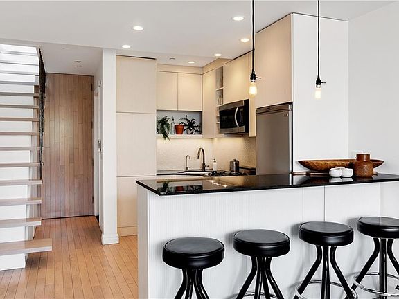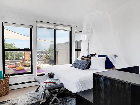 Your Penthouse Duplex Dream 1BR with 352 SQ FT Private Roof Terrace Awaits. New to Market! Imagine a sunny and quiet oasis at the crossroads of Williamsburg & Greenpoint, in a completely gut-renovated and thoughtfully re-imagined one bedroom home. Facing North & East, residence #401 gets spectacular sky and light all day long with open epic views and lush greenery out of large windows. This duplex, two level home, is just three flights up and features tons of private outdoor space. Renovation highlights include beautiful white oak real wood floors, sleek chef s open kitchen with best in class stainless steel appliances: Bertazzoni range, LG fridge, Bosch dishwasher, breakfast bar, deep Kohler cast iron kitchen sink with built in Multi Pure water filtration system, & tons of cabinet storage. With your own Miele washer/dryer in unit, wonderful bedroom ceiling fan, in wall A/C units on both levels, and unbelievable masterfully designed built-in storage space including walk-in closet. This Pet Friendly building features a central laundry room, common courtyard, and roof deck. Located in a boutique 24-unit building near the Graham Ave L Train and Nassau Ave G Train and within a few blocks of three amazing public parks. 99 Kingsland Avenue is also close to trendy restaurants, cafes, yoga studios, art galleries, shops, and bars on Graham Ave & Bedford Ave. Easy street parking with quick commute into Manhattan. Make it your own or rent it out for high income with low common charges and low taxes. A home not to be missed.