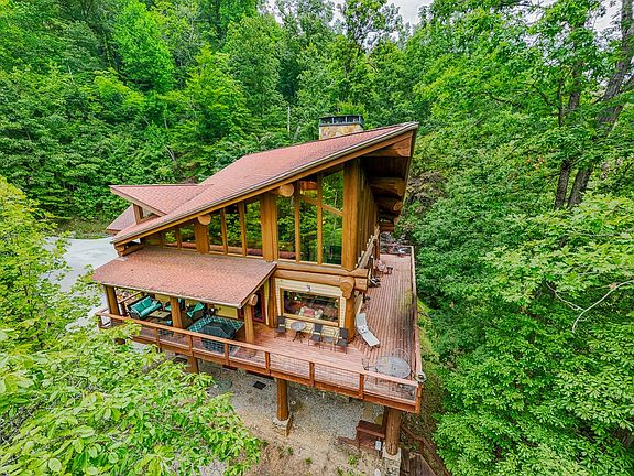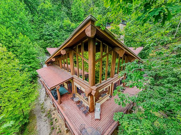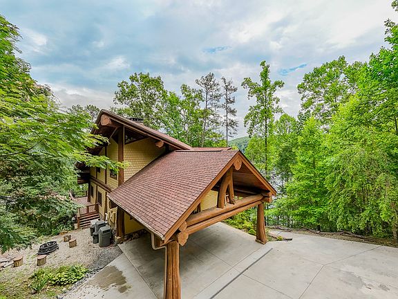 Embrace the charm of lakefront living w/ this stunning western red cedar post and beam cabin, perched above the serene waters of Lake Fontana! Sold fully furnished, this cabin offers a unique blend of rustic elegance & modern convenience. The main level boasts massive log timbers, soaring ceilings, & expansive windows, creating a treehouse-like atmosphere. The spacious kitchen features ample cabinet & counter space, granite countertops, & an island w/ a breakfast bar. The XL great room is highlighted by a grand stone gas fireplace. The main level primary bedroom includes a cozy fireplace & an ensuite bath w/ dual granite vanities & a large step-in shower. The upper level hosts an open loft overlooking the living area, a second bedroom w/ an ensuite bath, & a bonus bunk room complete w/ a fireplace & kids play loft. The basement is home to a den/rec room, a third bedroom w/ an ensuite bath, & a large storage room. Outside, you'll find a concrete driveway leading to an oversized 2-car carport, a wrap-around deck w/ a covered porch, & a hot tub overlooking the lake. A walking path leads to the water, complete w/ a ramp and covered dock, perfect for enjoying the best of lake life!