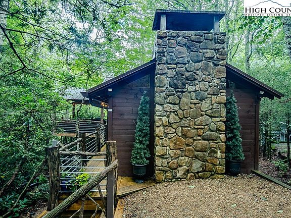 Thinking back to your childhood, did you may have wanted to live in a treehouse. This home makes you feel like you are in a treehouse. Every part of this home has a serene mountain feel to it. The deck walkway opens up to a peaceful sitting area with a cathedral roof. This is the ideal area to curl up with a book or watch the game. When you enter the main living area you may notice the beautiful saw milled wood. The kitchen is of moderate size with a gas stove and a beautiful wood island for more prep and storage. The ceiling in the kitchen has solid saw milled wood and exposed beams that add to the mountain feel. As you go into the dining room, the ceilings are cathedral which add to the beauty of the living room. As you go into the living room, the large stone wood fireplace is the main focal point. The fireplace is a great place to cozy up on those cold winter night. All three of these areas face the North to Northeast wall that allows for an abundance of natural light in. The main level bathroom has the mountain charm while providing a spa like environment. Wherever you are on the main level, you can see what mother nature is up to outside. The stairs that lead to the primary bedroom loft are built with the same saw milled wood. The primary bedroom is cozy and includes a portable air conditioner. There is a lot of natural light through the skylight and windows. Lying in bed you can watch the treetops and the heavens through the sky light. The same care you find on the main level is seen throughout the lower-level bedroom with its mountain touches. You will want to invite your friends and family to stay. The adjacent bathroom is tastefully updated giving you the spa feel as well. There is a fire pit area off of the lower bedroom that invites you and your family to enjoy some s'mores.