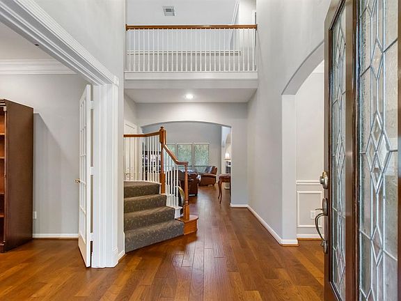 MOVE IN READY!! Gorgeous home on private lot with mature trees conveniently located in Alden Bridge. GREENBELT means no rear neighbors! High ceilings, archways and lots of natural light .Plantation shutters on rear of home. Recent updates include new engineered wood floors on first floor, new carpet in MBR ,tankless water heater and new heater for spa. New pool equipment 2018. Updated kitchen with Corian counter tops and all new SS appliances and gas range. Freshly painted in a neutral grey. Enjoy entertaining on your covered back porch overlooking sparkling pool and heated spa. Pool bath completes the package. Walk or bike to highly rated Buckalew and Mitchell.