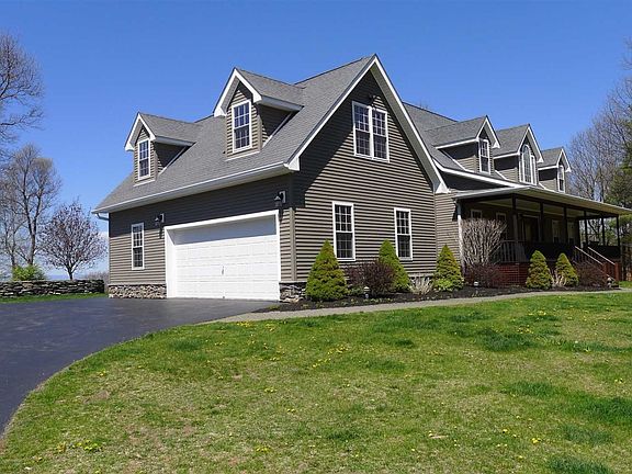 Long private drive leads to spectacular Catskill Mountain and Hudson River Valley views from this Milan hilltop retreat. Custom designed and built by one of Rhinebeck's leading builders, the home features an open floor plan oriented toward the breathtaking views, landscape and fieldstone walls. On the first floor, the entry hall leads to powder room, dining room, gourmet kitchen, and living room with stone fireplace and vaulted pine ceilings and Master suite with bath and radiant heat. Large deck with sunscreen awning facing views and swimming pool is perfect for entertaining. Second floor features two guest bedrooms and a bath plus huge bonus room/office/playroom. The finished basement is set up as an exercise room and has great natural light. Attached and heated 2 car garage. Also included is a detached 2 car garage /workshop with very nice guest suite above. Beautiful private, quiet and serene setting just minutes from the Taconic Parkway, Red Hook and Rhinebeck. A must see!