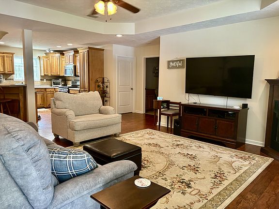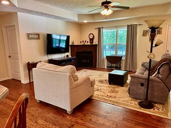This very cute well maintained 3 BR, 2 BA home sits on a large lot! The Living areas have Hardwood floors, tile baths and carpet only in guest bedrooms. The Den has fireplace, trey ceilings and ceiling fan, kitchen has beautiful wood cabinets with pantry, island with eat at bar, upgraded stainless steel appliances. Appliances include stove, microwave, and DW. The Master Bedroom has trey ceiling, ceiling fan, new LVP flooring, large walk in closet, full bath with tile walk in shower, make up vanity and linen closet, guest bath has tile surround on tub & tile floors, guest bedrooms are nice size with large closets, sunroom on the back is great get away to have your morning coffee, walk out onto the deck & large fenced in back yard with storage shed. This home has woods behind it and in front of it giving it lots of privacy. It is one of only 3 homes at the end of the road. Giving a safe place to play. all this and a great 2 car attached garage. with cabinets. Concrete double driveway.