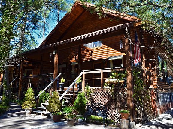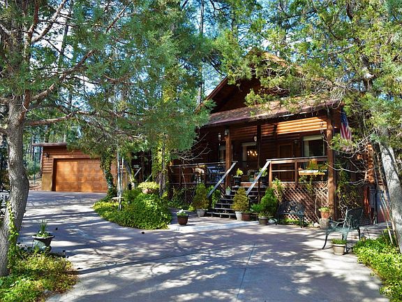 Log cabin living bordering the national forest! This beautiful 7-inch full log home sits on .43 of an acre tucked back into the trees at the end of a cul-de-sac. This home features 2700 square feet, three bedrooms, two bathrooms, oversized two car garage with storage, large loft/family room and bright kitchen with ample storage. The living room opens up to the kitchen and dining area with vaulted ceilings covered in tongue and groove pine, custom chandelier and a wood burning stove. The huge upstairs bedroom has plenty of space for multiple family members or guests. Step out on to the covered front deck and feel like you are sitting in the middle of the rain forest, the landscaping is superior. Out back on the patio you'll enjoy the views of the national forest and the wild life.