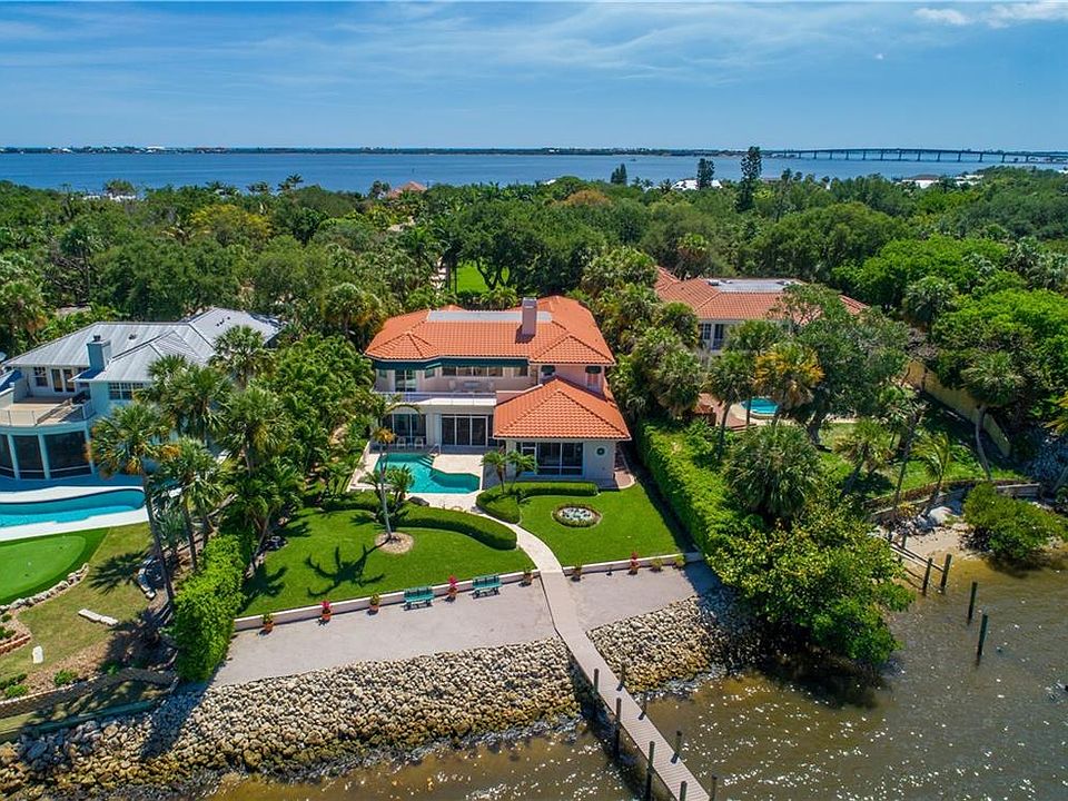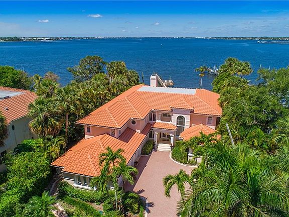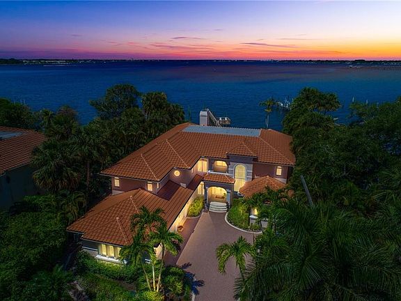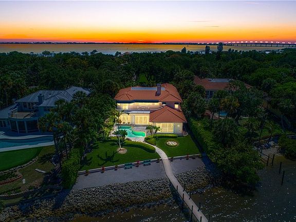 #99 N. Sewall's Point Rd is 'Sunset Central' all year long. This private, peaceful 5650 sq/ft 5BR 5/2 bath gated estate is approached along a stately private driveway, graced with towering Royal Palms and protected by dense ficus hedgerows on either side of the expansive lawn. A massive, mossy live oak tree shades a serenity garden just off the 3 car garage. Between 2013-14, nearly every aspect of this property was improved or replaced: vegetation, irrigation, generator, dock, seawall, shutters, woodwork, gutters, pool gear, awnings, flooring, appliances, propane tank - plus paint and roof. (Floor plans and features list attached.) Deep water dockage is included, with new rip-rap and 'beach' installation (2017). There are master suites on both floors, and an ensuite room for a caregiver.The daily prize is the sunset - looking right down the 'chute' of the wide St. Lucie River to the Roosevelt Bridge, and all the charming wildlife that this thrilling Intracoastal setting has to offer.