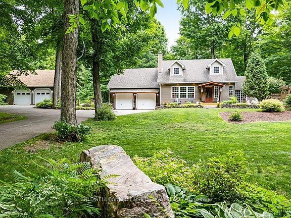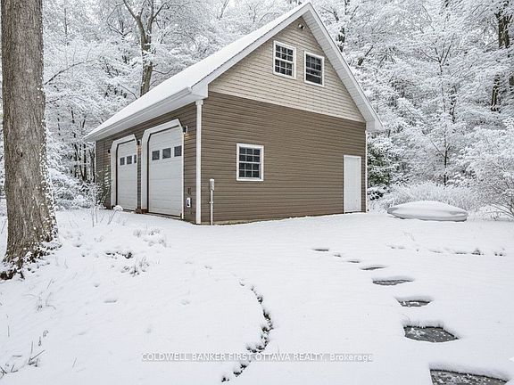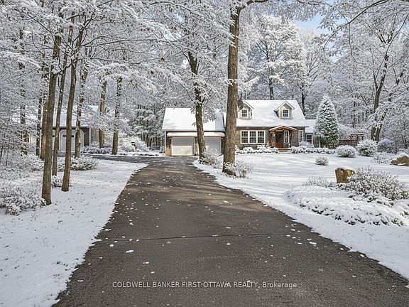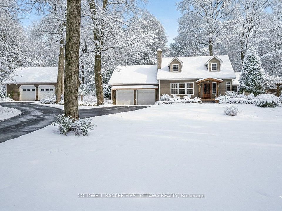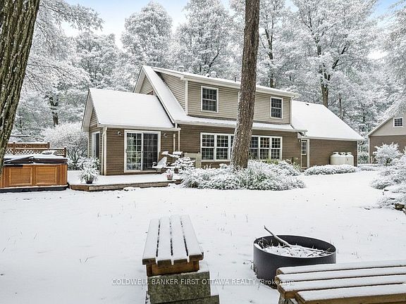 Easy to fall in love with this irresistible Cape Cod home and its landscaped gardens blending into the surrounding tranquility. On private acre that feels like a park, the three bedroom home has attached double garage plus detached double garage-workshop. The front walkway has deck perfectly designed for quiet times, watching spring perennials bloom and birds sing. Light-filled foyer adjacent to coat room with large windows. Open floor plan offers defined family spaces; never-ending walls of windows, maple floors and 8' ceilings with high-end recessed lights. Livingroom full of natural light flowing in from oversized windows and has stone fireplace with Jotul woodstove insert. Dining room wall of windows frame great outdoors. Contemporary 2022 kitchen with quartz counters, ceramic matte backsplash, island-breakfast bar, upscale appliances and Tiffany lights. Dinette has full-length windows giving you views of backyard oasis. Family room three sets of patio doors open to wrap-about deck with 2023 salt-water Artic Spa hot tub. Combined powder room & laundry station renovated 2024 with slate-like tile floor, decorative copper sink, custom wrap-about counter & shiplap ceiling. Mudroom door to garage and also door to yard. Upstairs, you have office/flex room. Sunny spacious primary bedroom deep window dormers with built-in bench and, walk-in closet with window. Two more large bedrooms, one with walk-in closet. Second floor bathroom a delight; all renovated 2023 with gorgeous custom vanity & luxury rain-head glass shower. Home has radiant hot water heating with wall radiators and 2025 propane boiler. Mini-split 2019 A/C. Hot water on demand 2025. Auto Generac can power whole home. Attached garage has epoxy floor & 240 V. Detached garage insulated, 250V, hoist, floor drains, windows & big loft. Hi-speed. Cell service. Located on paved township paved road with garbage pickup & school bus route. Just 4 mins to Lower Rideau Lake boat launch. 10 mins to Smiths Falls or Perth.