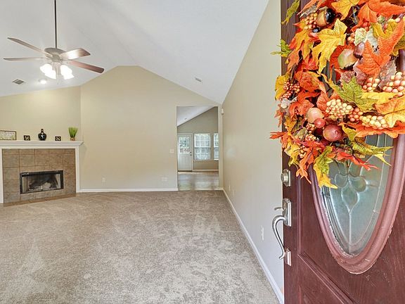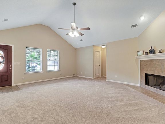 Nestled under live oak trees and surrounded by nature, this beauty has been pressure washed, all walls and ceilings painted including the garage, and new carpet installed in the living room, hall and bedrooms including closets. This wonderful floor plan starts with a living room that has a high ceiling and a cozy fireplace. Two bedrooms are situated to the left with a Jack and Jill bathroom. To the right is an oversized kitchen with lots of prep room as well as two possible dining areas. The laundry room is spacious and close to the garage entrance. Down the hall from the kitchen is a tray-ceilinged master bedroom with a walk-in closet and a double vanity master bathroom. Enjoy a quiet evening on your front porch or private rear patio!
