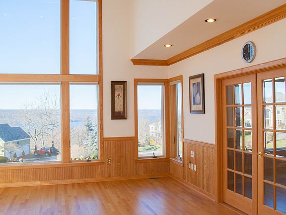 This LakeWatch luxury showcases incredible Cayuga Lake views. 2-story foyer features a sparkling chandelier, and Italian marble flooring. Great room with double sided fireplace, 17' ceiling, wall to ceiling windows, to capture fabulous northwest lake views. Bright and expansive kitchen w/ center island & built-in cooktop, solid Brookhaven cabinets, built-in Subzero refrigerator. 2nd kitchen offers gas stove, pantry and privacy while entertaining. Sunroom w/ access to expansive side deck. Master with private En-suite with more lake views. Open catwalk allows views through the Great room. Home is trimmed to perfection with oak wainscoting and/or crown molding (cut from local trees). Fully-finished, walkout lower level features a built-in entertainment bar, full bath with styling area, two bonus rooms with closets - perfect for guest quarters. Additional home features include whole house water softener, Lennox Furnace with built-in humidifier, radiant floor