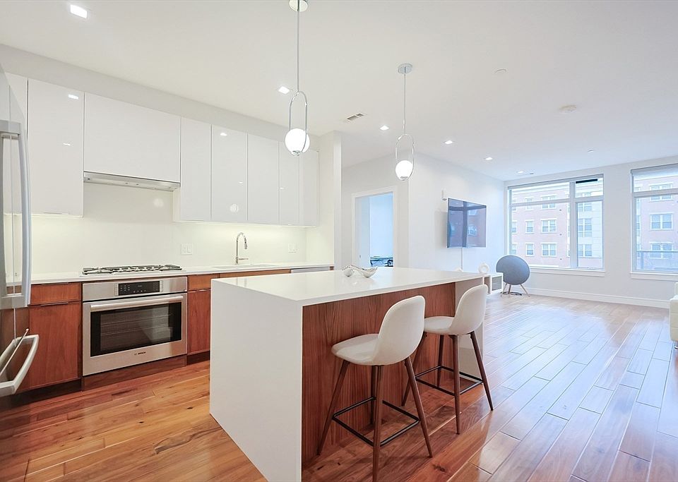 Silestone quartz waterfall islandPrivate balconyWaterfront city skyline viewAbundant natural lightSoutheast-facing unitBosch appliances