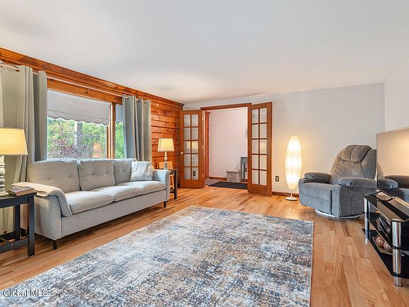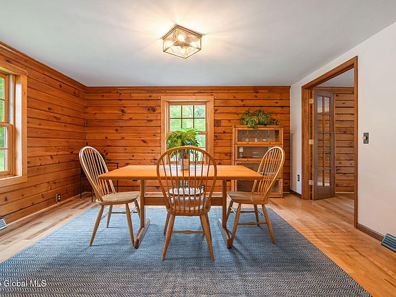This move-in ready ranch home with a recently remodeled kitchen, brand-new roof with a 50-year warranty and updates throughout, is built to last. The traditional layout of the main floor is supplemented by a dramatic chalet-style great room featuring two-story ceilings and a floor-to ceiling stone fireplace that adds to both heating and ambiance. The living space extends onto a large deck, overlooking the koi pond and horse barn on a 5-acre wooded private lot with a seasonal stream. The modern comfort of a huge primary ensuite blended with knotty pine accents and interior log walls to complete the relaxing Adirondack lodge feel of the home. This one-of-a-kind property is a true retreat, and just under 30 minutes from Albany.