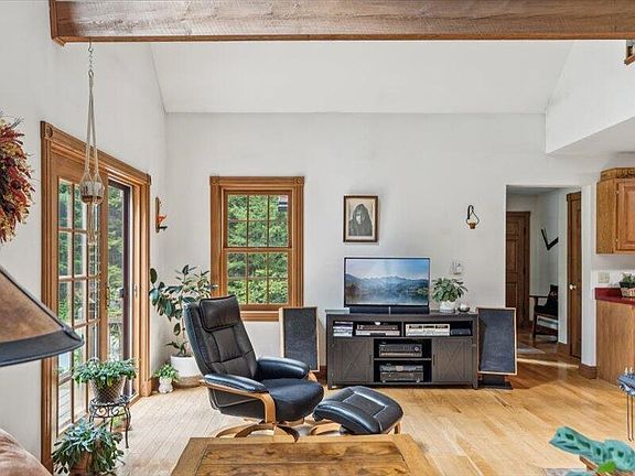Step inside to a bright and cheery living room, featuring cathedral ceilings and a slider leading to the front deck, filling the space with natural light. A lovely dining room sits just off the kitchen, making it ideal for everyday meals or entertaining.