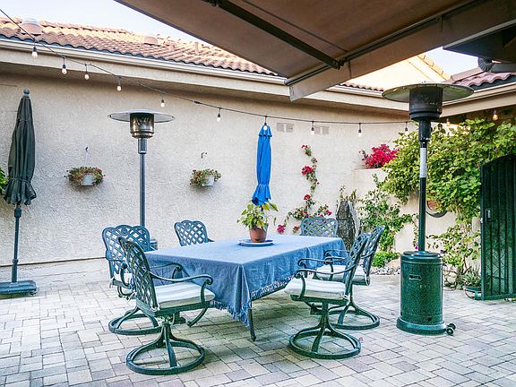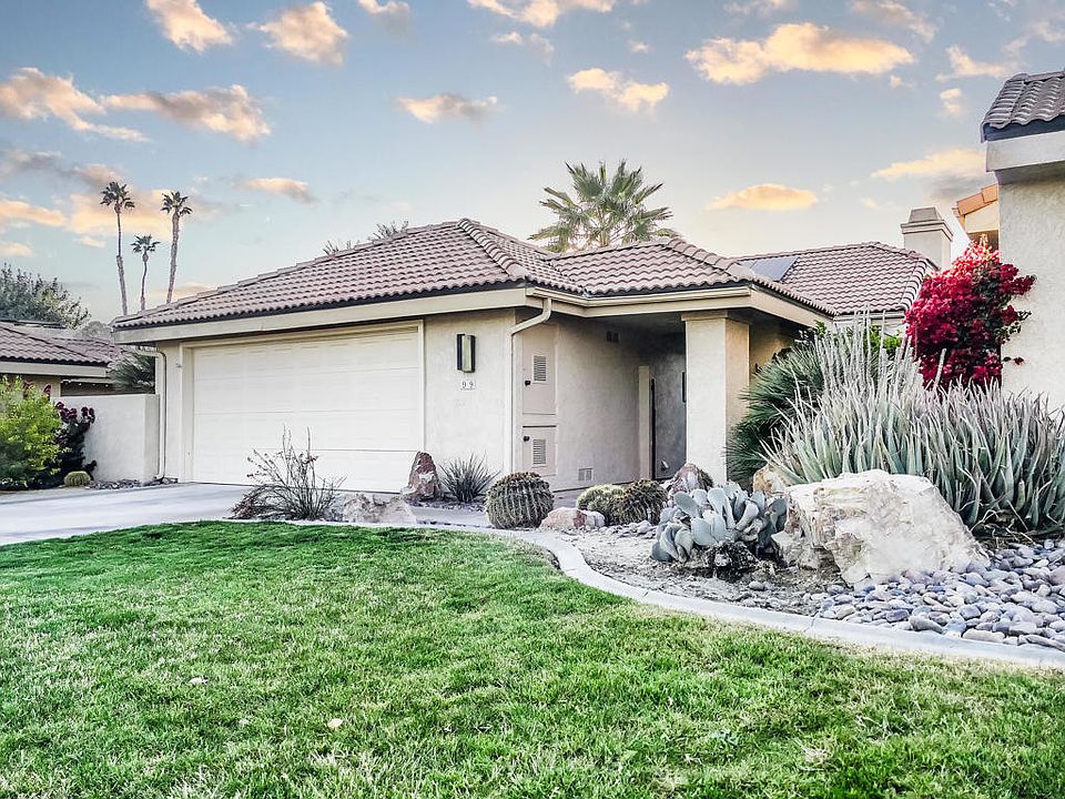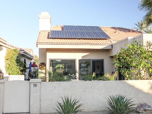 Welcome to Silver Sands Racquet Club... a guarded gated community of 256 homes centrally located.This popular G plan with two master suites is tastefully upgraded with newer appliances, granite counter tops, coffee bar, upgraded fireplace, vine cooler, self closing cabinet doors and drawers in the kitchen. New Entry door, new carpet in the bedrooms, blackout blinds and closets with self closing cabinets. The new furnace has been moved on the roof and a wall has been removed for more space in the kitchen.Freestanding unit with no common walls interlocking pavers and a million dollar view of the sunrise and sunset from the living room. Large windows to enjoy the mountains, pool and greenbelt views of one of the best locations in the complex.Motorized awnings on the front and rear side to enjoy the outdoorsTwo car garage is upgraded with built-in cabinets, epoxy floors, Air conditioning and owned Solar with EV charging.SSRC amenities include a fitness room, 15 pools/spas, 8 lighted tennis and pickle ball courts with a tennis pro on staff. Make Silver Sands Racquet Club.. Palm Desert's best kept secret your home.