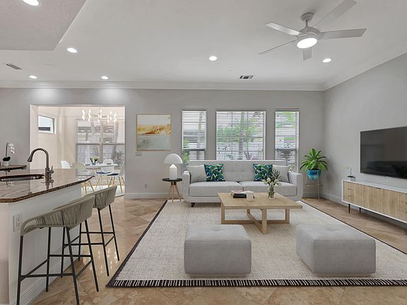 Welcome to 99 Via Poinciana, a beautifully updated townhome offering the privacy of a single-family home with no shared walls--only attached by garages. Nestled in the heart of East Boca Raton. Ride your bike to the beach, shops, and restaurants from this exquisite residence in the highly sought-after gated community of Royal Poinciana. The neighborhood is beautifully manicured, offering a warm community atmosphere with a heated pool and a dog-friendly environment.This semi-detached home boasts over 2,500 square feet of light-filled living space. It features three spacious bedrooms, each with its own ensuite bathroom, an additional powder room, and a charming home office. The tranquil backyard provides the perfect setting for relaxation or play. The open-concept kitchen seamlessly (MORE) flows into the family and dining rooms creating an ideal space for entertaining and family gatherings. Recently updated throughout, the home is bright, modern, and inviting. Every detail has been thoughtfully considered, from fresh paint and new lighting to elegant fans and plush new carpeting in the bedrooms.
