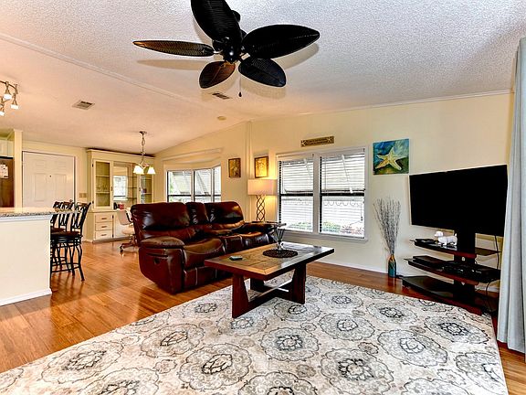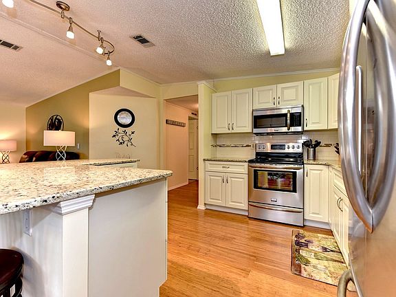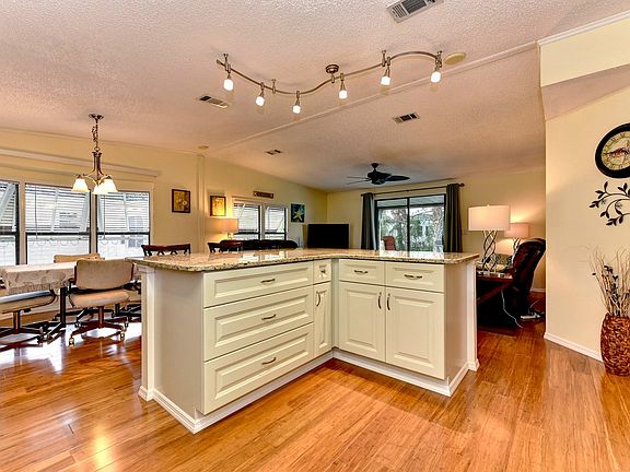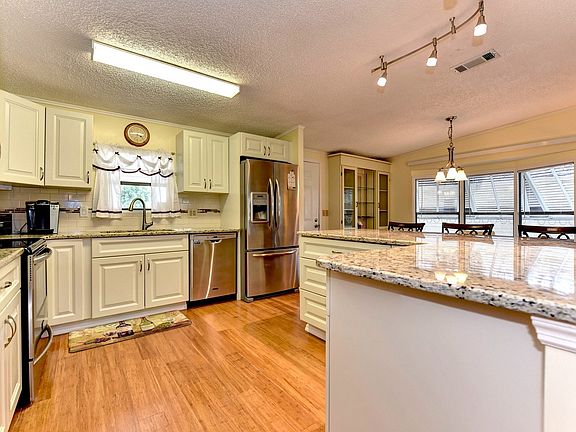 Gorgeous Move-In ready with 2015 roof, new kitchen, new paint, and new flooring throughout, and remodeled baths. Walk in the front door to a cheery open floor plan with a completely remodeled kitchen. Enjoy high-end stainless appliances, beautiful granite counters and a large island with breakfast bar. Cabinets are also new, solid wood, and complete with pull-outs and a corner lazy-susan. Main living area and kitchen is durable solid bamboo flooring. Walk through the patio doors to a freshly tiled lanai that overlooks a peaceful creek and pond, all situated under mature oaks for shade. The lush landscaping gives you a feel of an enchanted forest! There is also an outside patio area adjoining the lanai. The guest bedroom also has a nice waterview and new queen sized bed plus a large walk-in closet. Master bedroom is spacious with a large walk-in closet and remodeled bathroom with new vanity, fixures, ceramic tile and walk-in shower. The guest bath has also been redone with new vanity and ceramic tile and features a tub/shower combo. An inside utility room is complete with washer and dryer. All window coverings convey with the home. Out front is a double-wide carport and large storage shed, complete with a workbench. This home is being sold completely furnished. All located in the Gated Community of Ridgewood Oaks, only $171 a month for Condo/HOA fee which includes lawn mowing and in-ground sprinkler system with recycled water. This active 55+ community has scheduled activities, a clubhouse with pool and hot tub, tennis courts, shuffleboard, and 24 hour manned guard gate for extra security. Close by for shopping is the Ellenton Outlet Mall and many restaurants. Conveniently located off of I-75, it’s a short drive to Bradenton and Sarasota and the beautiful beaches of Anna Maria Island. This home is too nice to last – come and see it today! Seller is a Licensed Realtor.